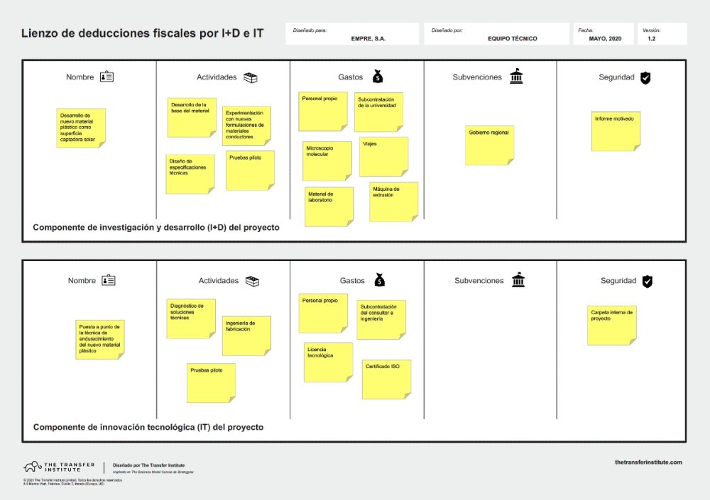 El lienzo de deducciones fiscales por actividades de investigación y desarrollo (I+D) e innovación tecnológica (IT) es una herramienta analítica exclusiva y gratuita desarrollada por The Transfer Institute para visualizar el proceso de análisis de los incentivos fiscales a un determinado proyecto realizado por una empresa.