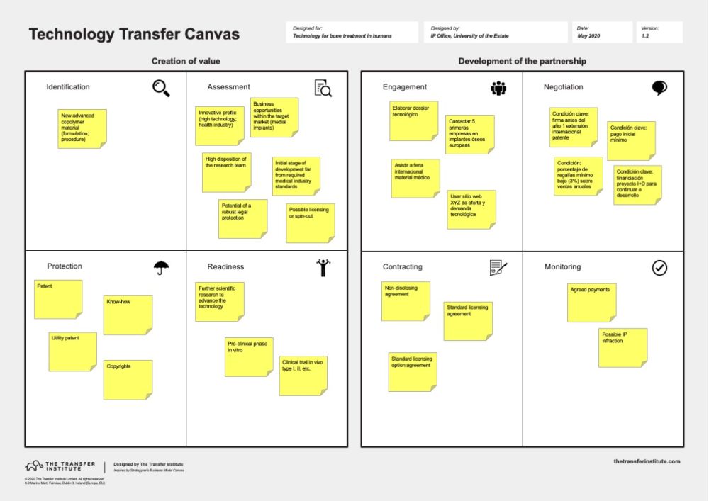 The purpose is to have on a single page all the information related to the technology transfer process to support strategic analysis, decision-making and training, in a clear and effective way. The outcome is to get a sort of roadmap of the key actions to implement. It is a tool that follows the trend of canvases so popular in recent years that are an excellent aid for reflection.